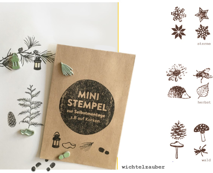 Die Tüte enthält Stempelgummis zur Selbstmontage (ohne Holz). Die Stempelgummis können mit z.B. Alleskleber auf einen Weinkorken oder ein Stück Holz geklebt werden.